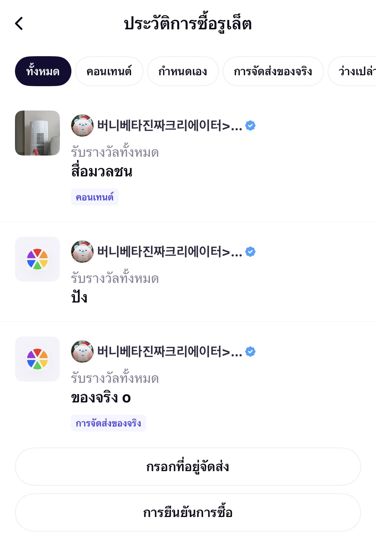 สามารถใช้ฟิลเตอร์ด้านบนของหน้ารายการที่ซื้อเพื่อเลือกดูเฉพาะรางวัลที่ต้องการได้