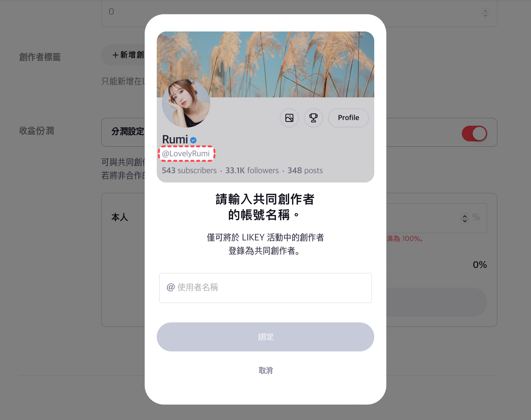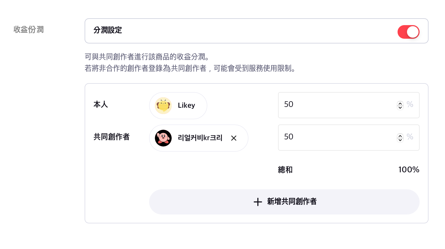 为每位共同创作者设定分润比例。