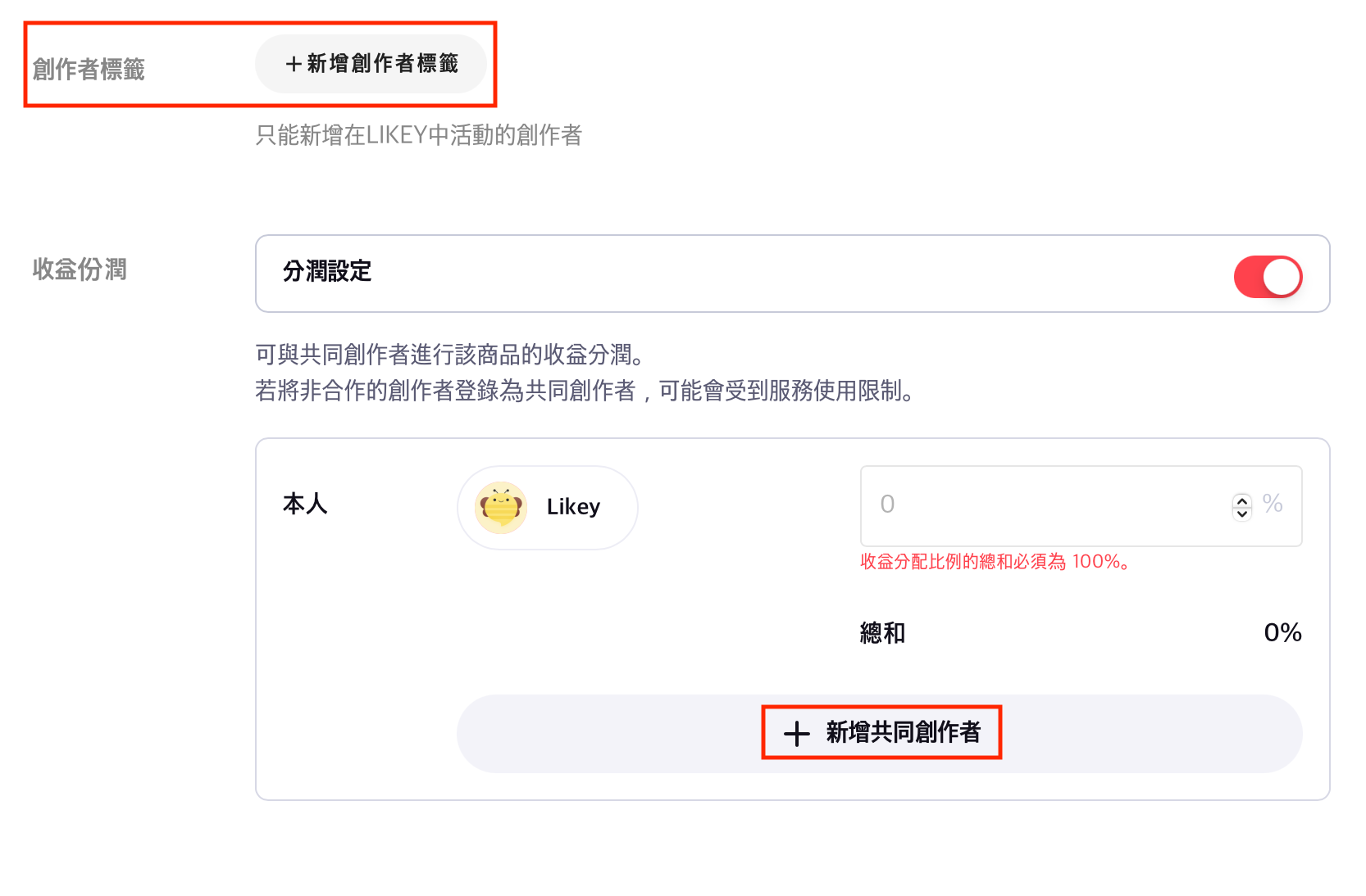 *建議同時在上方「創作者標籤欄位」中標註共同創作者,商品內容才會標注創作者。