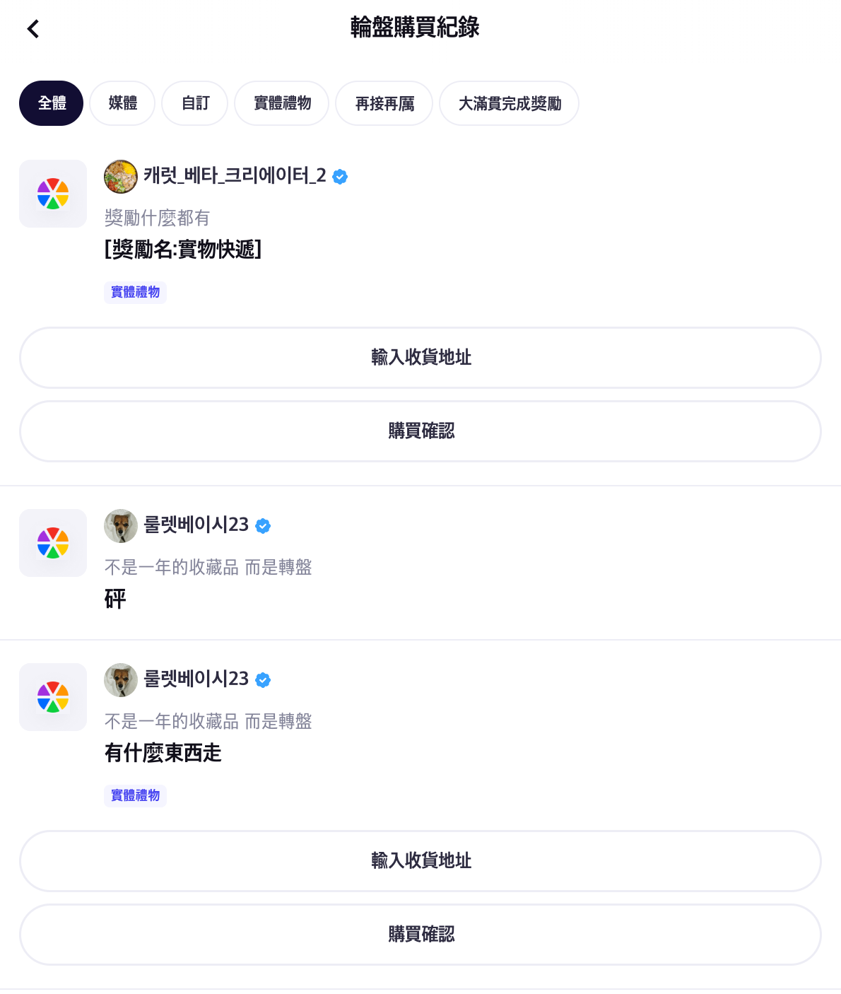 - 我的頁面 > 購買項目 > 輪盤 — 集中查看所有輪盤參與紀錄